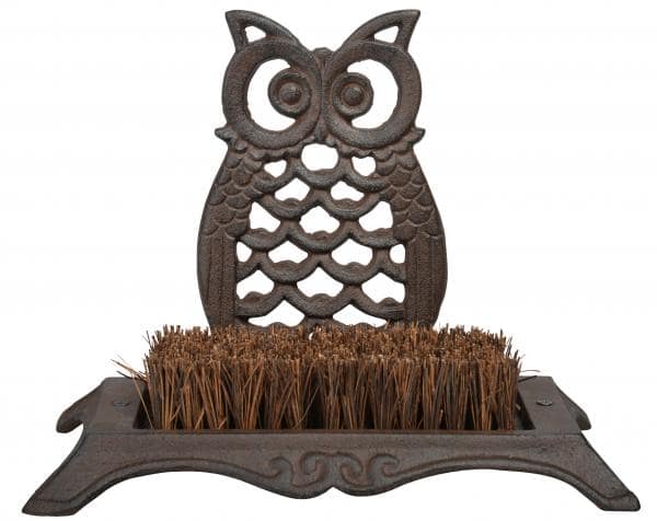 Öntöttvas cipőtisztító, sárlehúzó bagoly mintával.