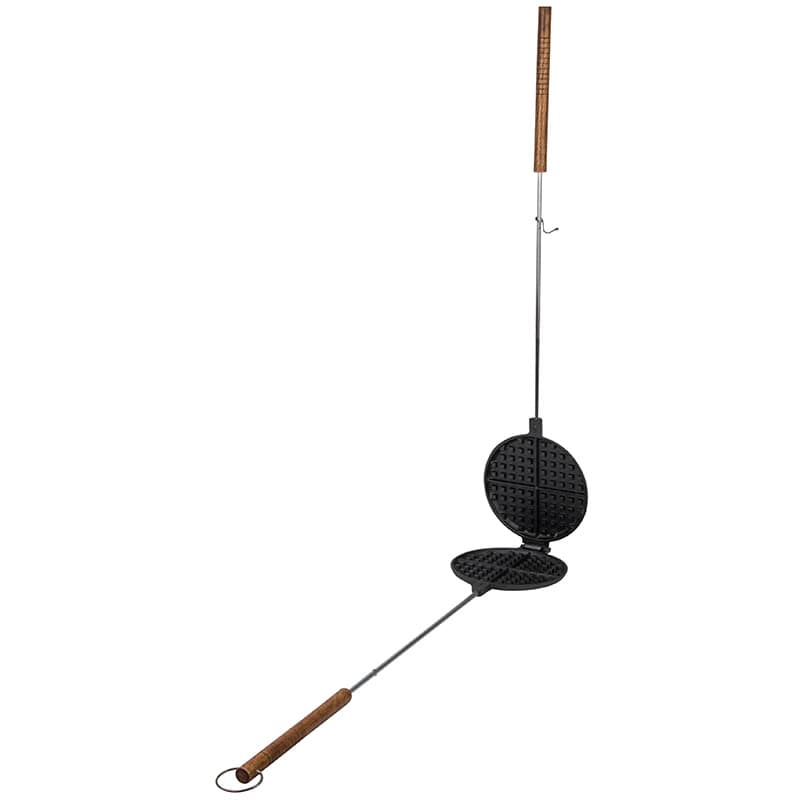 Gofri sütő serpenyő. Hosszú nyele miatt kifejezetten alkalmas tábortűzön való sütögetéshez. Anyaga: fém, fa.