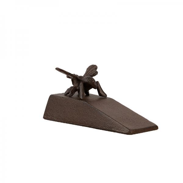 Öntöttvas ajtókitámasztó méhecske mintával, amely nem csupán dekoratív lakáskiegészítő, hanem praktikus használati tárgy is. A kitámasztó kifejezetten úgy lett kialakítva, hogy az ajtó alá be tudjon ékelődni és ezzel megfékezni az ajtót a becsapódástól. Öntöttvas jellegéből adódóan, kinti használat esetén a korrózió megjelenésével egy patinásabb, rusztikusabb termék válik belőle.