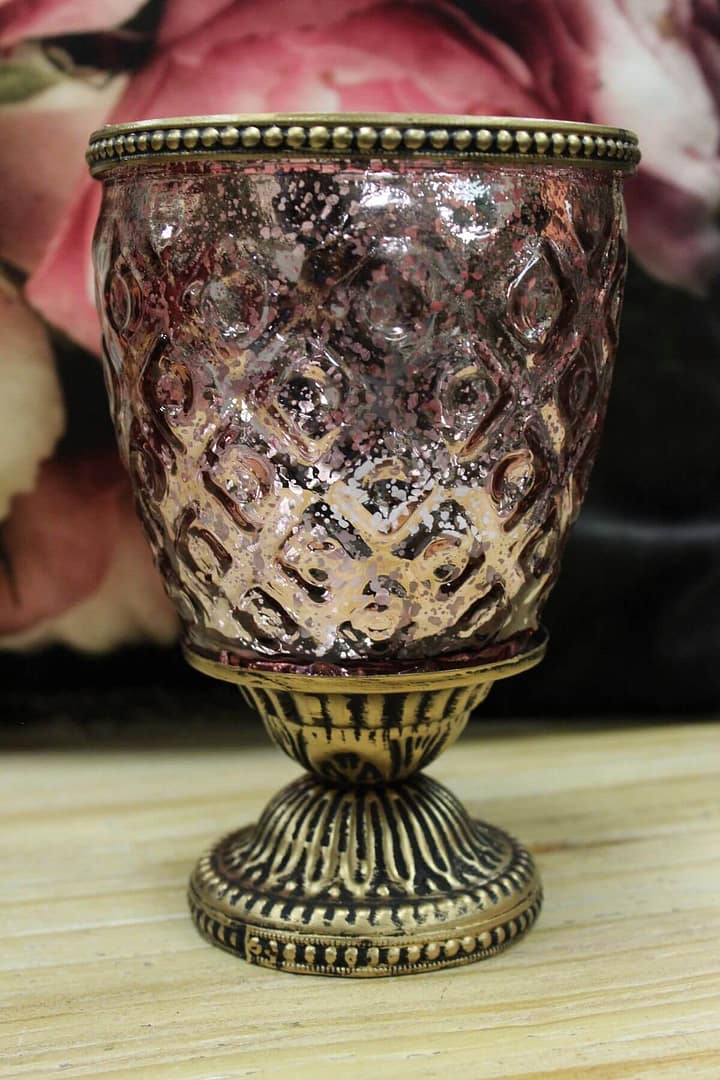 Rózsaszín, üvegpohár alakú, rusztikus gyertyatartó. A gyertyatartó teteje egy fémperemmel van szegélyezve, amely illik a talapzathoz. A gyertyatartó vázaként, gyertyatartóként, ill. tartóként is szolgállhat különféle dekorációkhoz.