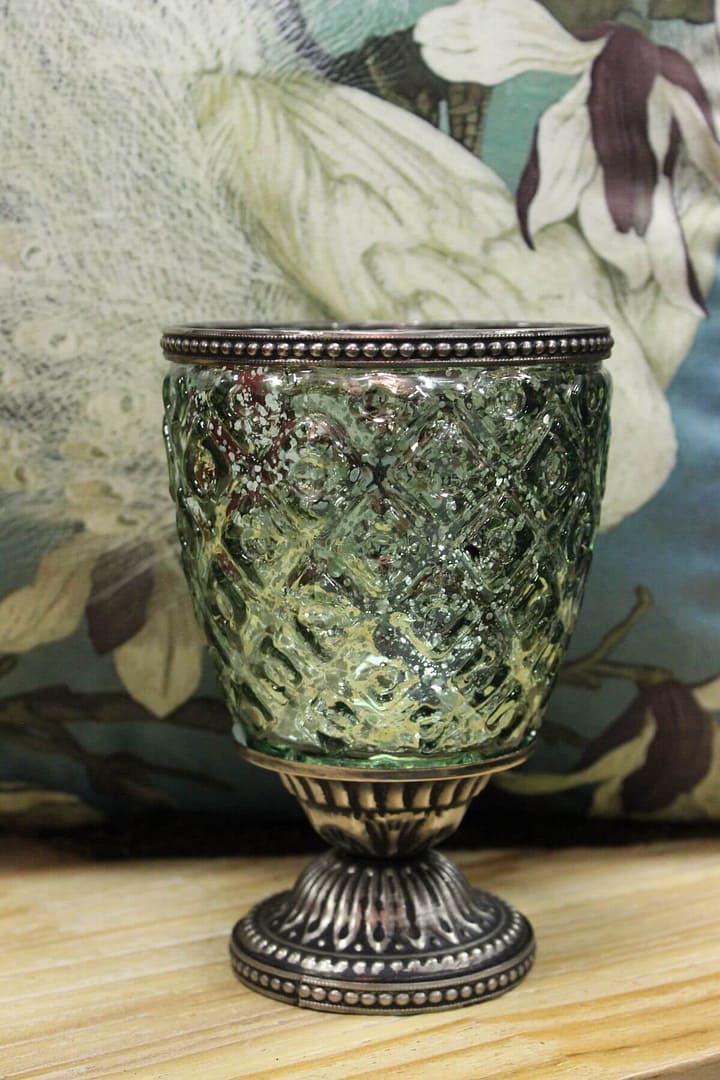 Zöld, üvegpohár alakú, rusztikus gyertyatartó. A gyertyatartó teteje egy fémperemmel van szegélyezve, amely illik a talapzathoz. A gyertyatartó vázaként, gyertyatartóként, ill. tartóként is szolgállhat különféle dekorációkhoz.